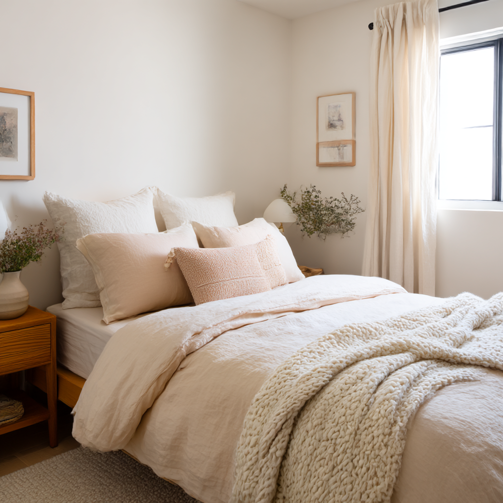 Bedding plays a major role in how cozy a small bedroom feels. Opt for fabrics that feel comforting and relaxed, such as cotton, linen, or soft blends.