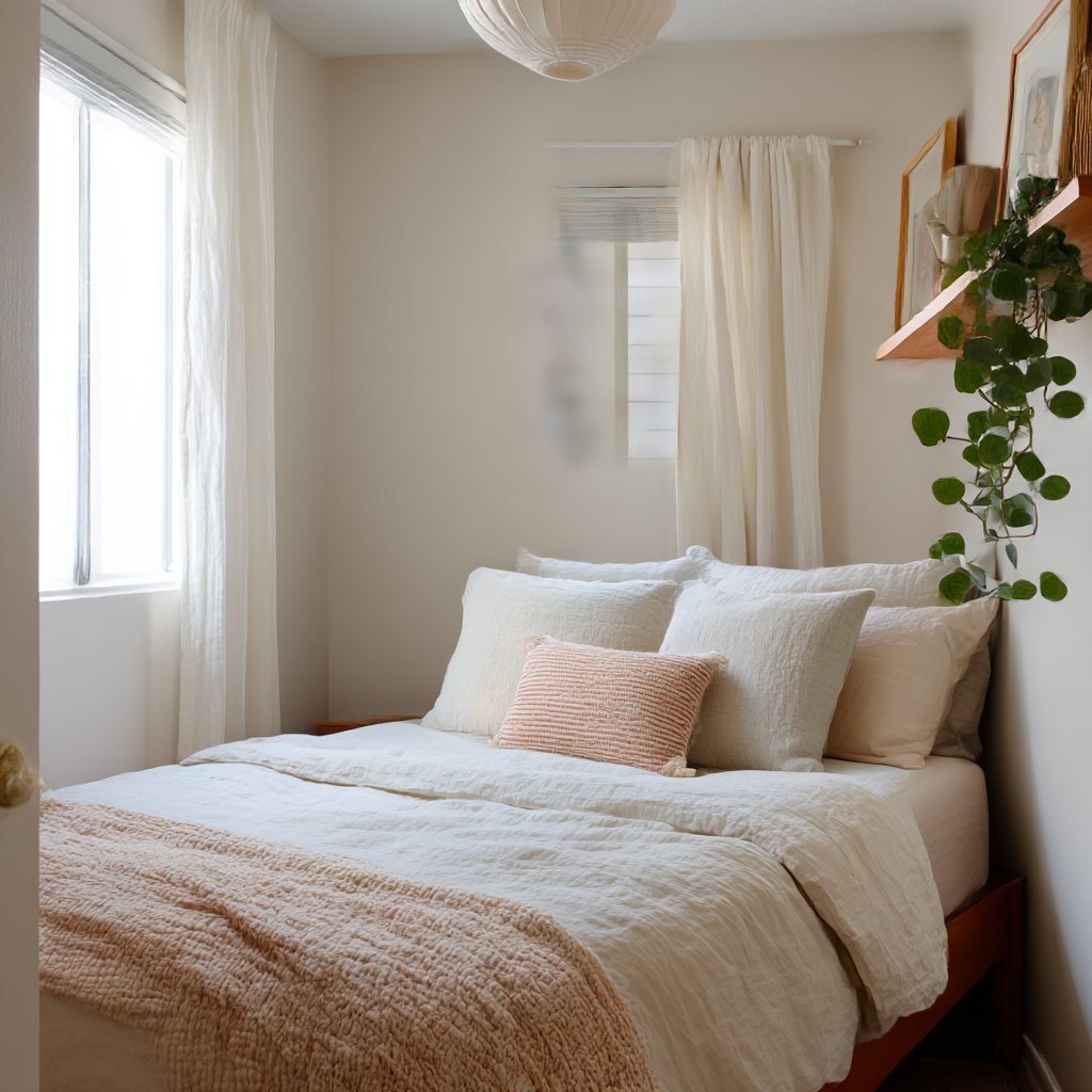 Natural elements bring calm and balance to a small bedroom. A small plant, dried stems, or natural wood accents help soften the space.