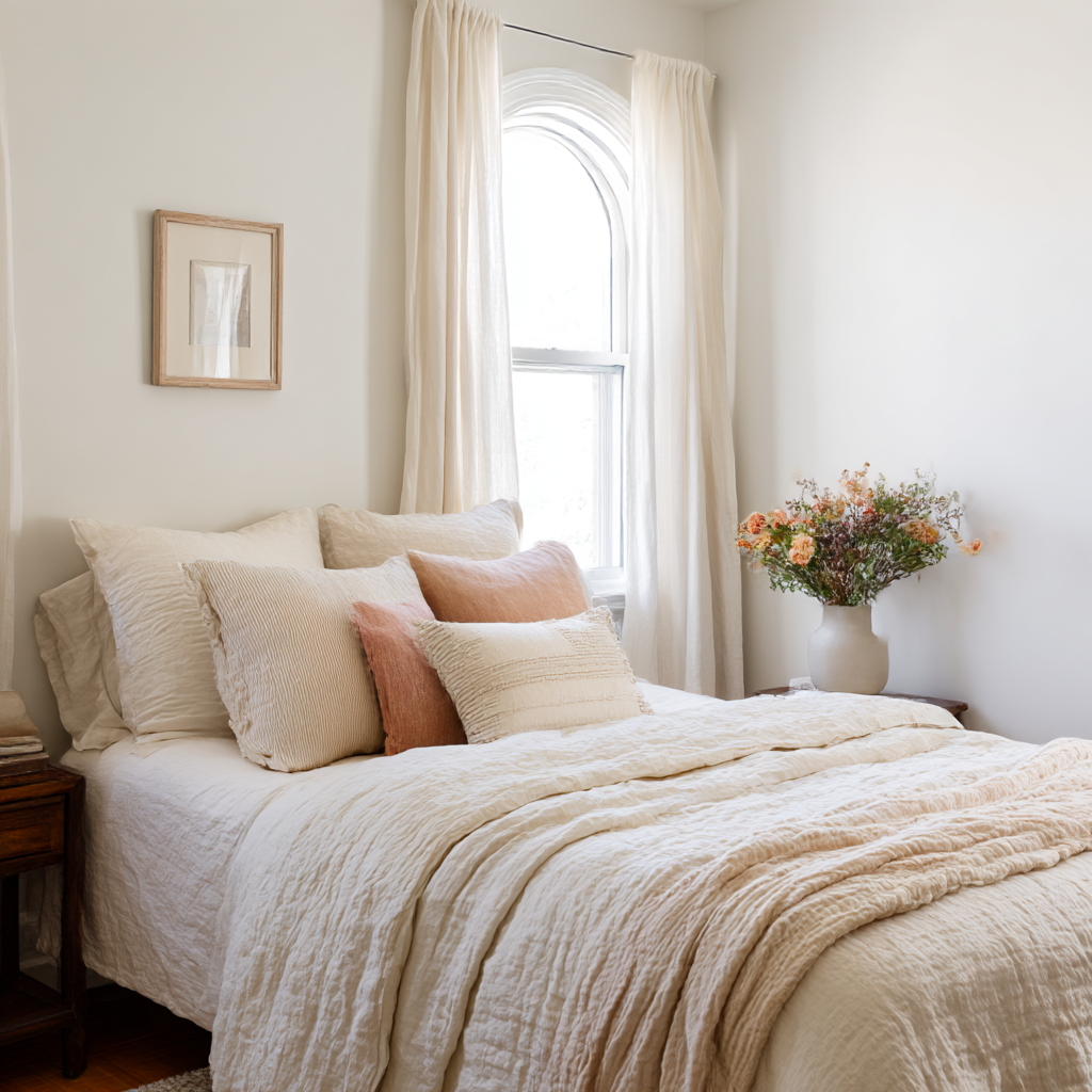Sheer or linen curtains add softness without blocking light. Keeping window treatments simple helps the room feel airy and serene.