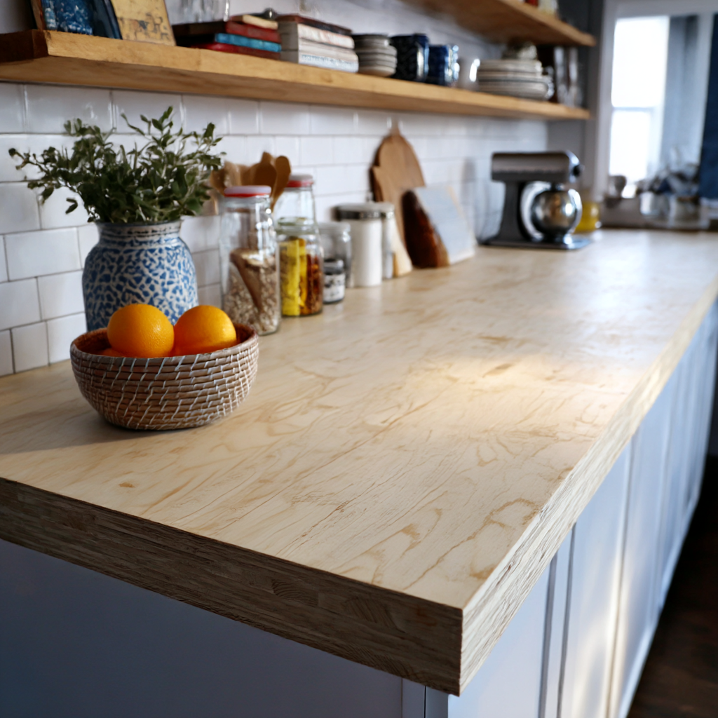 In farmhouse-style homes, plywood countertops can be stained in warm honey or walnut tones to mimic the richness of solid wood. Combined with apron-front sinks, vintage-inspired fixtures, and open shelving, plywood contributes to a relaxed and welcoming atmosphere.