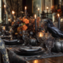 Simple black plates and elegant glassware complete the look, ensuring that the table feels both inviting and stylish. This setup is perfect for a Halloween gathering, balancing spooky vibes with chic decor.