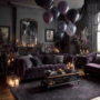 Incorporating spooky yet chic accessories can transform your living room into a Halloween haven. The image showcases a stylish space featuring a dark color palette, perfect for the season. A striking chandelier hangs above, adding a touch of elegance while casting a warm glow.