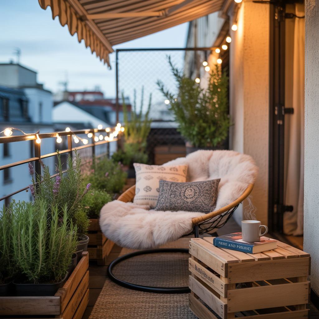 A hammock chair is perfect for small balconies. It takes up minimal floor space but provides maximum comfort. Add a small side table for your coffee mug and reading glasses. String lights create the perfect ambiance for evening reading sessions.