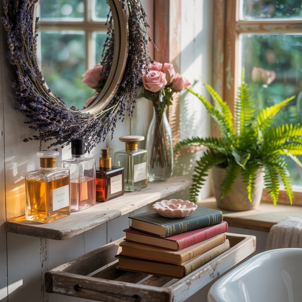 Display collections that speak to your heart. Antique perfume bottles catch light beautifully, while vintage novels on wooden bath racks suggest leisurely soaking sessions. Circular mirrors framed with dried flowers bring nature indoors, creating focal points that feel both intentional and organic.
