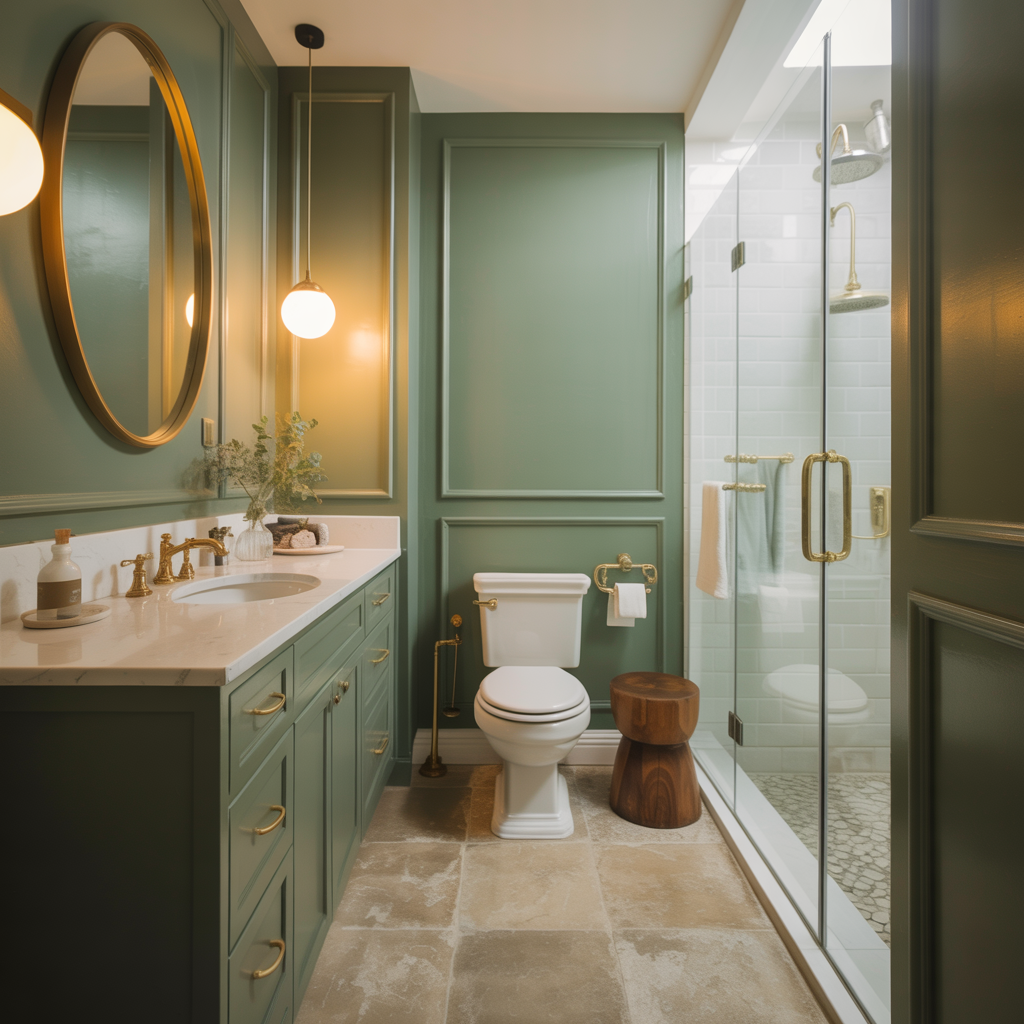 Choose your green intensity based on your bathroom’s natural light. North-facing bathrooms benefit from warmer sage greens that compensate for cool lighting. South-facing spaces can handle deeper forest greens without feeling cave-like.