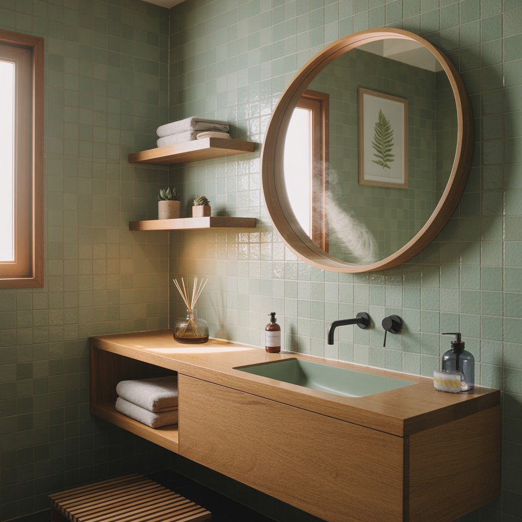 Natural wood elements create the perfect complement to green tiles, establishing a connection to nature that feels both grounding and luxurious. Wood brings warmth that prevents green spaces from feeling cold or clinical.