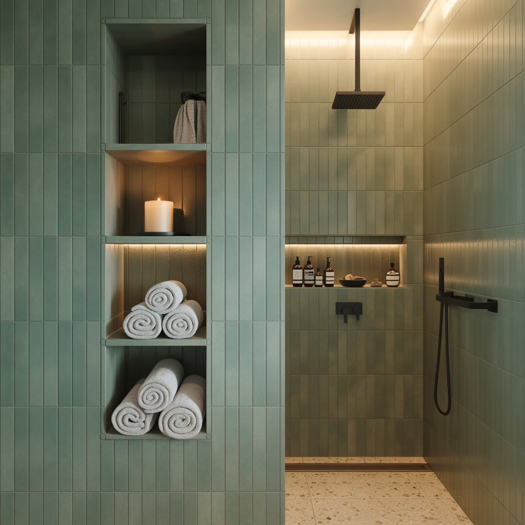 These recessed spaces work perfectly for storing toiletries, candles, or small plants. When lined with the same green tiles as your walls, they create seamless integration that feels intentional and polished.
