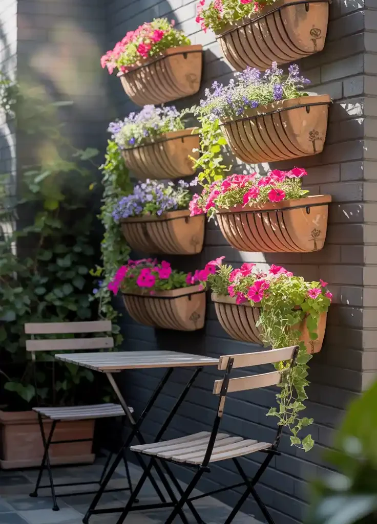 Vertical planters are a fantastic way to make the most of limited balcony space. In the image, you can see a beautiful arrangement of hanging pots filled with vibrant flowers. This setup not only adds color but also maximizes the use of vertical space. By using the wall, you free up floor area for other activities.