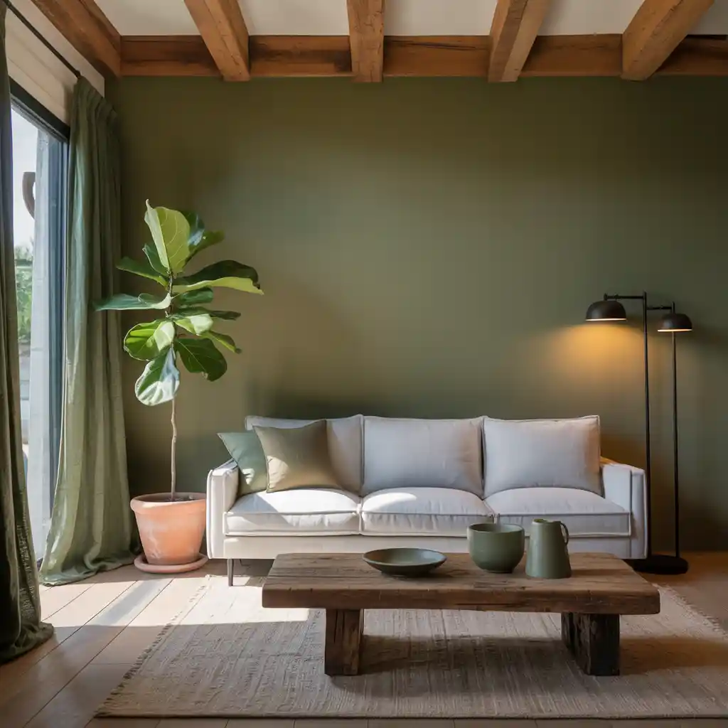 Olive green offers a more muted option that pairs beautifully with warm wood tones. Consider an olive green accent wall behind your sofa or fireplace. This creates a focal point while maintaining the room’s peaceful atmosphere.
