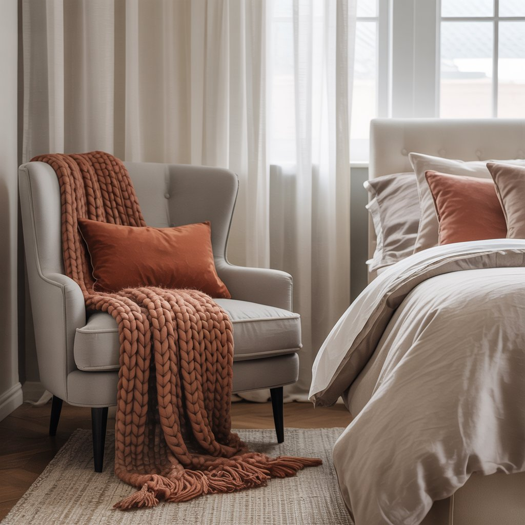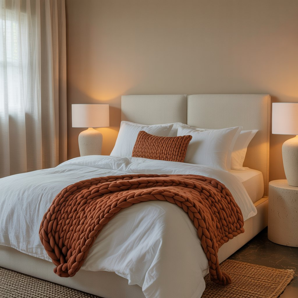 Start with soft beige walls as your foundation, then layer in terracotta through chunky knit throws draped across pristine white bedding. The contrast is striking yet harmonious, creating visual interest without chaos. White linens keep the space feeling clean and airy while terracotta accents add that essential warmth.
