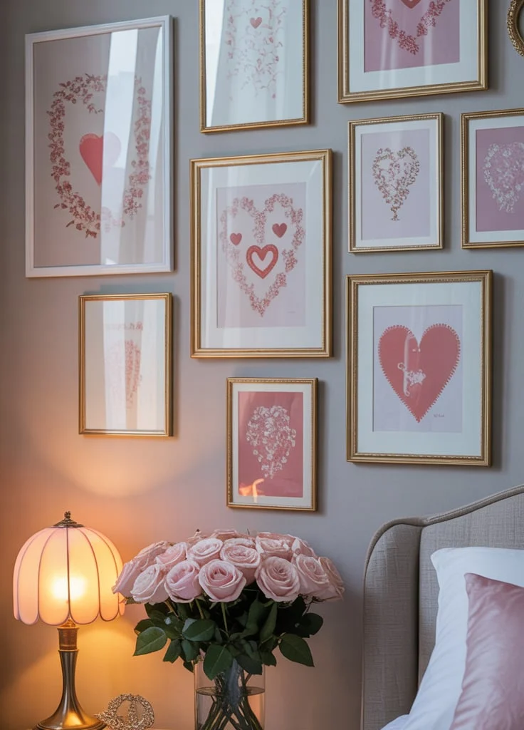 When selecting artwork, think about pieces that resonate with you and your partner. Look for images that spark joy and connection. The heart illustrations and tender moments captured in this display add a playful yet intimate touch to the space.
