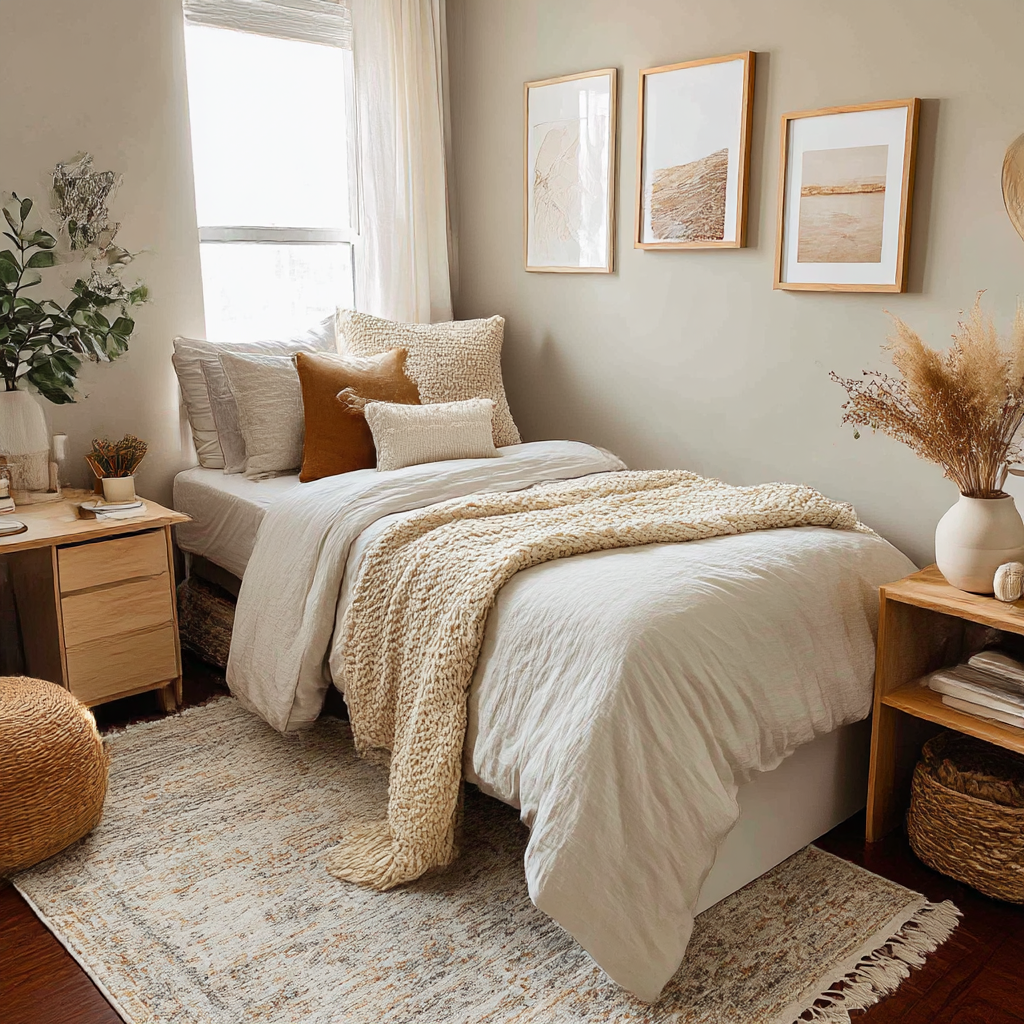 Earth-toned dorm rooms feel grounded, cozy, and effortlessly stylish.