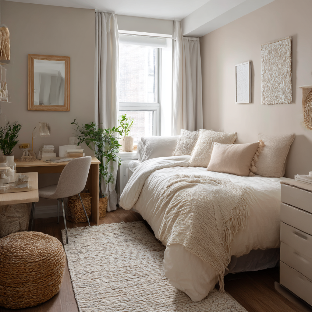 Neutral dorm rooms feel clean and airy, which is especially helpful in small spaces. They also make it easy to swap out accessories later without redoing the entire look.