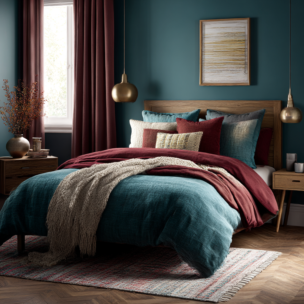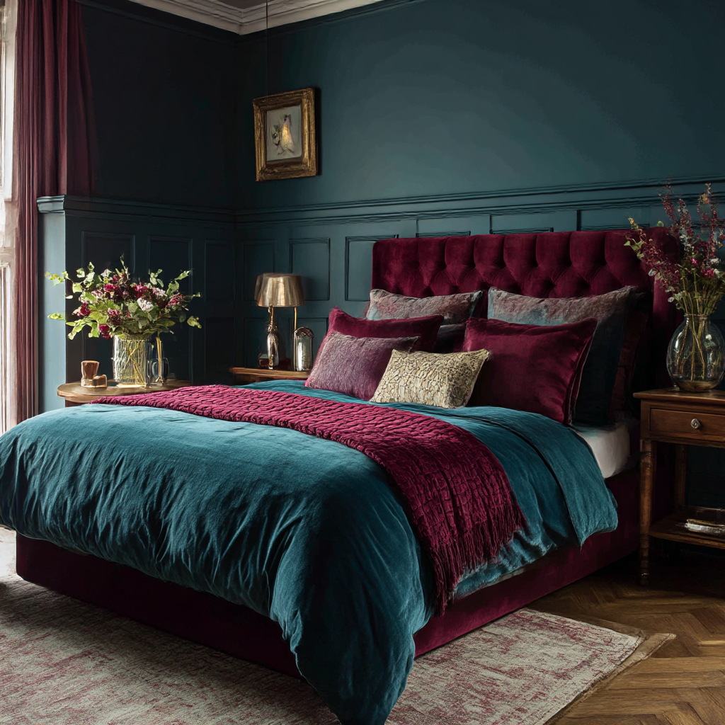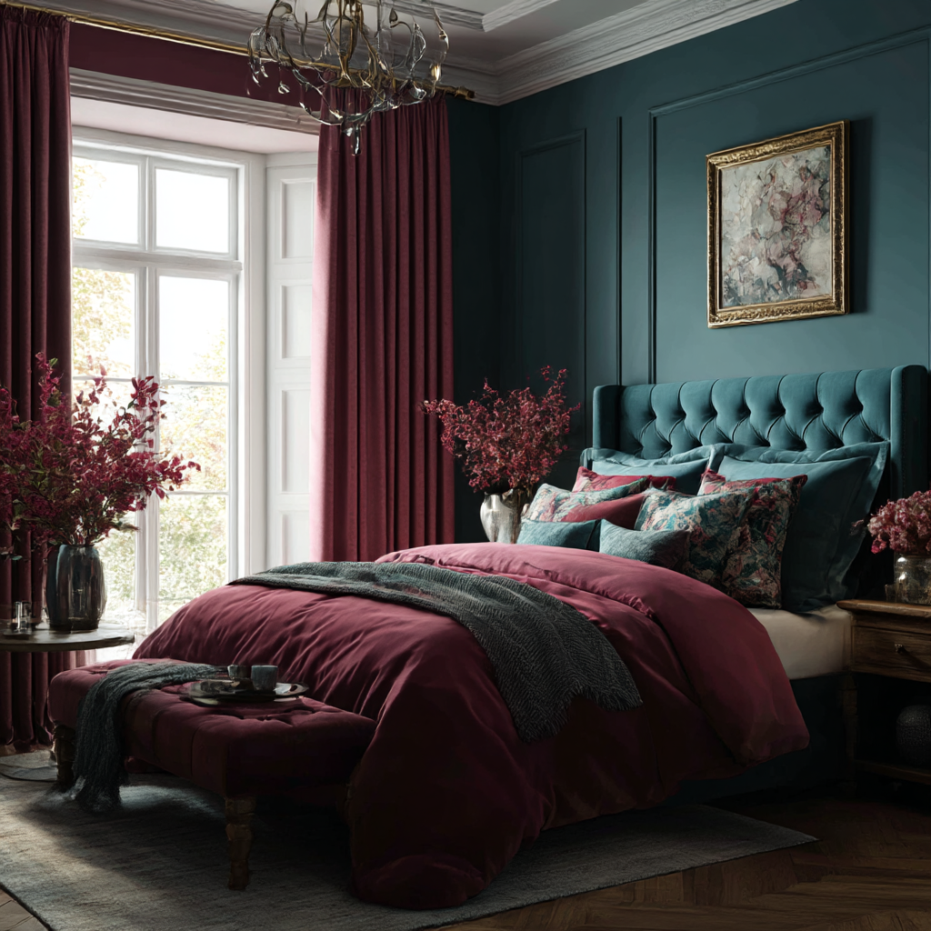 Teal and burgundy might not be the first colour combination that comes to mind when styling a bedroom — but that’s exactly what makes it so exciting. Rich, bold, and unexpectedly harmonious, teal and burgundy create a versatile palette that can feel cozy, dramatic, modern, or elegant depending on how you use it.