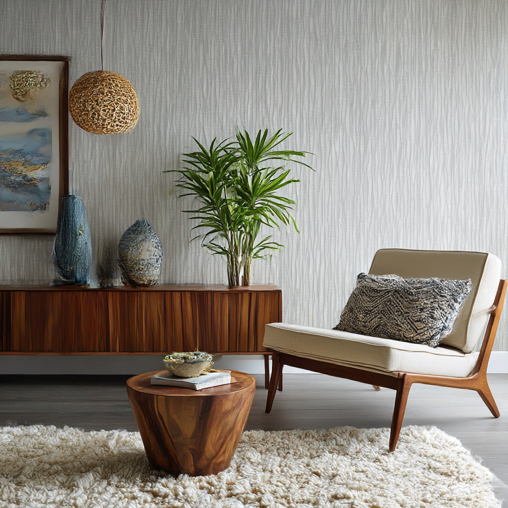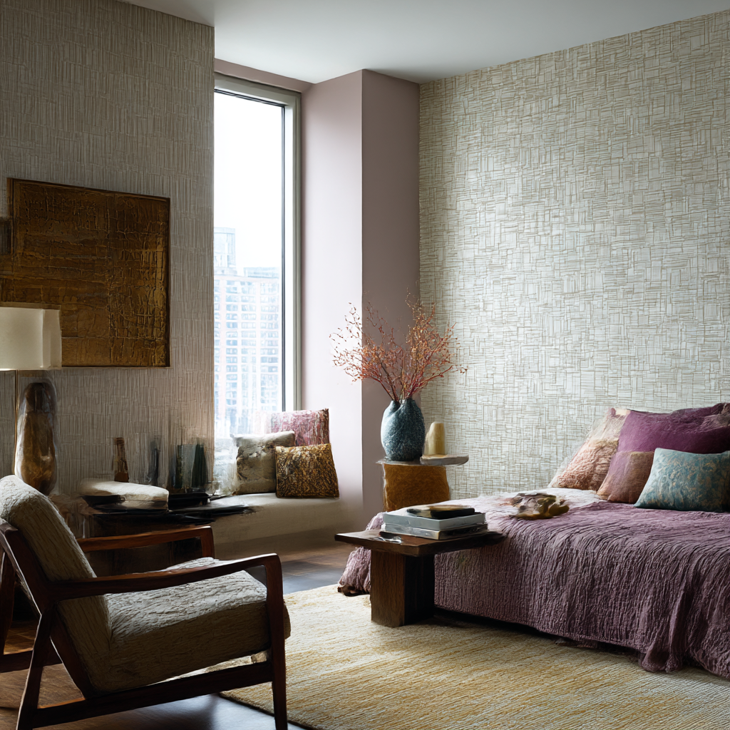 Keep decor simple and focus on contrast. Smooth furniture, natural materials, and thoughtful lighting help textured wallpaper stand out while maintaining balance.